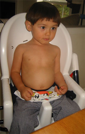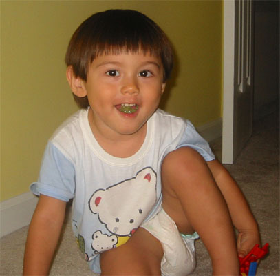 9/27/04 - 嗯,一邊嘴巴有葡萄,一邊覺得尿布也挺重的 看!葡萄還在耶!真是得意啊!!