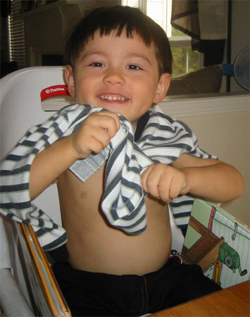 10/10/04 - 一到秋天換季時,就是Luka變成小暴露狂的時候。老是喜歡把手縮進袖子裡,然後再想盡辦法把衣服脫掉!