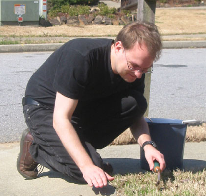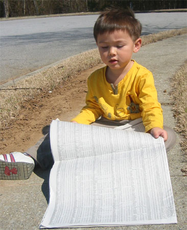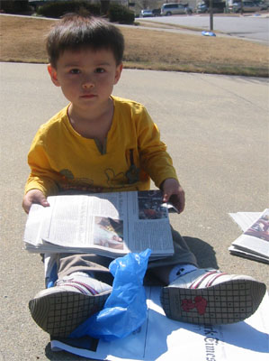 3/13 - 坐在車庫前看報紙,爸爸在一旁辛勤拔雜草