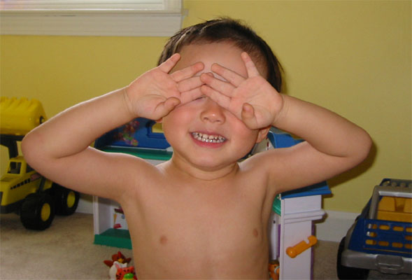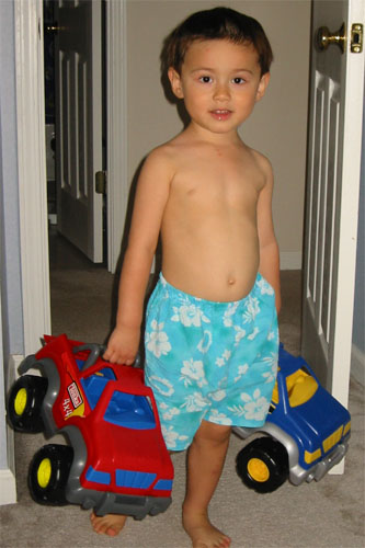 6/24/05 - 電腦出了點狀況,媽媽正在想辦法處理,過了一陣子之後,Luka就像照片這樣一臉無辜、一手各提一輛車,出現在電腦房間的門口,很哀怨地說:「媽媽,我們一起下樓去玩嘛........!」聽到這樣的聲調,媽媽二話不說,電腦關掉,照了張像,就跟Luka走了!