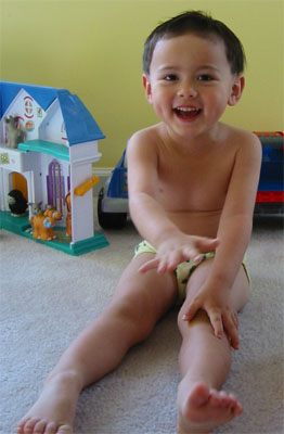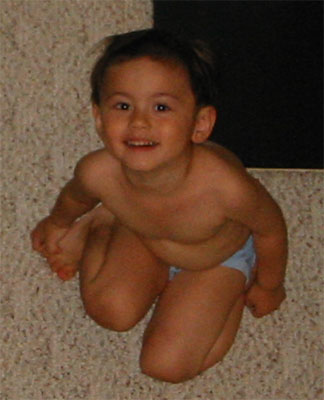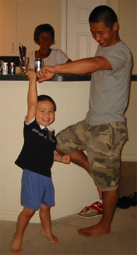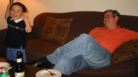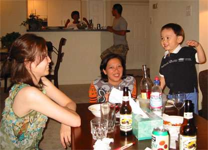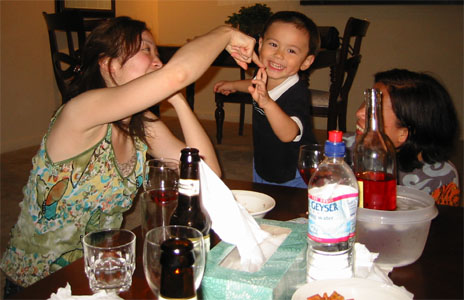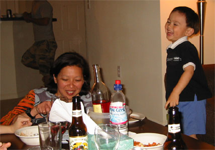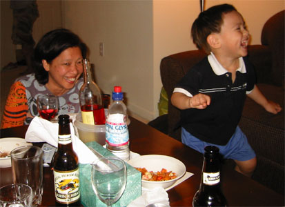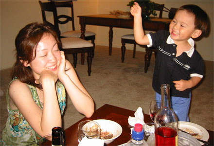 6/15/05 - 日本來的Tomomi阿姨下星期要回日本了,所以邀請同一個企劃案的同事到他住的地方吃咖哩,媽媽和Luka也在被邀名單中。吃完飯,大家在喝酒聊天時,Luka也開始耍寶,玩得很高興,嘴巴也笑得超級大!