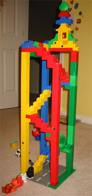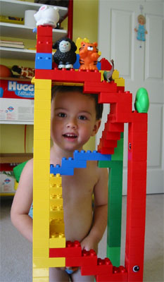 6/11/05 - 爸爸新蓋好的樂高大樓,動物們排隊要上樓
