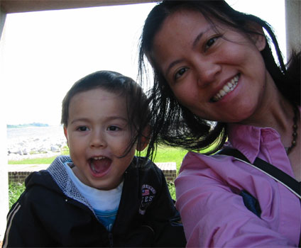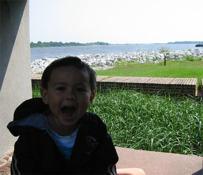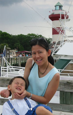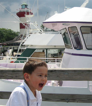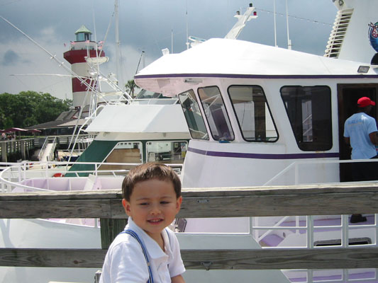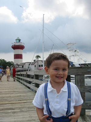 6/19/05 - Luka的爹又必須要到Savannah出差幾天,於是我們又一起開車來到Savannah。星期六出發,星期天到Savannah隔壁南卡的海邊小島Hilton Head Island玩。Hilton Head Island基本上是有錢人或退休人來度假的地方,很多的私人遊艇、高爾夫球場,不過既然是個靠海小島,當然也有沙灘和海水可以玩,也可以坐船出海去釣魚、看海豚、鯨魚、夕陽、海景等等。不過帶著不愛玩沙和海水的Luka,沙灘就可以省了,於是我們來到Harbour Town,碼頭的小鎮上,本來打算坐船出海看海豚和海景,可是星期天竟然沒什麼船出海,都在清理維修中!而且天空烏雲密佈,實在也不是出海的好天氣,只好作罷,就在這個鎮上走走逛逛,晃了一早上。
