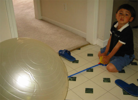 5/6/07 - 爸爸從農曆新年前傷到背,後來去看醫生,之後每星期六都定期去做按摩復健,在家也都乖乖做瑜珈中關於訓練、按摩、強化背部肌肉的運動。這天聽醫生的話,去買了顆大球來,準備做更多的運動。〈所以運動很重要,爸爸再也不敢懶惰都不動了〉不過最興奮地又是Luka,自己勤奮幫球打完氣〈媽媽當然有幫忙〉,直接宣告球是他的,連爸爸在運動都跑來搶!