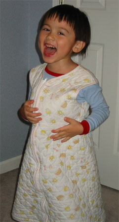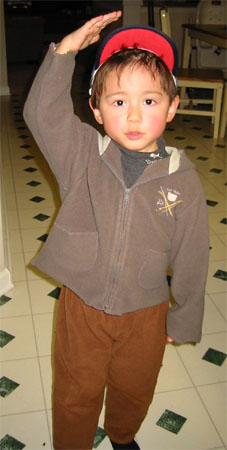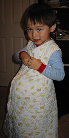 1/6/06 - Luka每晚都要想新把戲,好有藉口可以延遲九點要睡覺的事實。這星期的藉口是要打電話給阿媽,跟阿媽說「Luka工人ㄅㄟˇㄅㄟˊ」要休息睡覺了,平常講電話兩三句就敷衍完的情況,這時候就變成永遠都講不夠。照片這一天則是在耍寶,睡衣都已經穿好了,還是要先耍耍寶......