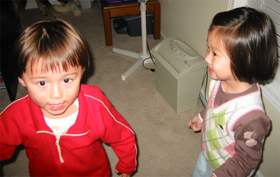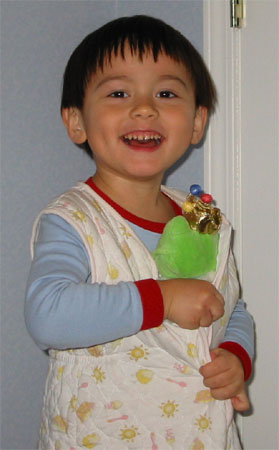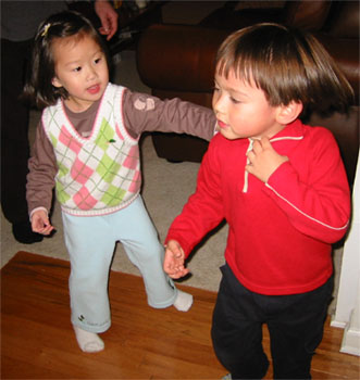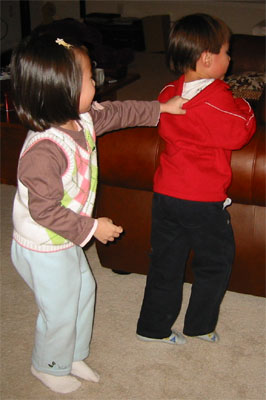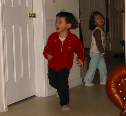 12/31/05 - 跨年夜,我們跑到Amy阿姨家吃飯,因為有另外一群台灣人也在那兒。Luka最樂了,因為除夕夜Luka的爹娘特准Luka不用九點上床睡覺。一整晚Luka就在一樓拉著爸爸繞著客廳、飯廳、廚房跑,當 race car。等到爸爸跑累了,這個小女生終於熱身完,敢跟跑瘋了的Luka玩。不過Luka繼續跑跑跑當賽車,小女生比較聰明,停在定點抓race car!不過後來也被Luka抓去當race car,也跑了起來!結果累壞了的race car Luka,在跨年前20分鐘不支睡著,沒能放仙女棒。不過媽媽有留三支讓Luka第二天睡醒後玩。結果不貪心的Luka知道媽媽留了三支仙女棒,很善良地說:「Luka只要一支就夠了,一支給媽媽,一支給爸爸!」真是不枉爹娘疼啊!