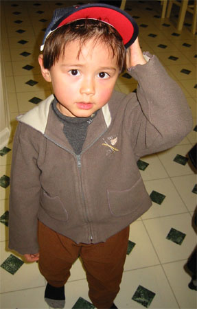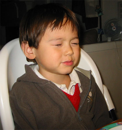 1/22/06 - Luka在耍寶嗎?是晚餐吃得快睡著了!牛牽到北京還是牛,不會因為長大了吃飯就不再打瞌睡!媽媽嘲笑Luka要睡著了,Luka還很倔強地微笑搖搖頭,一邊眼睛卻已經張不開了!唉......