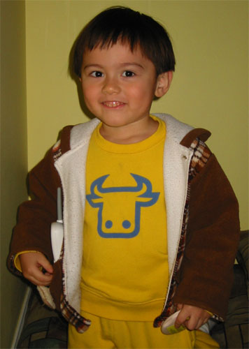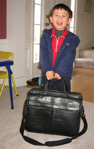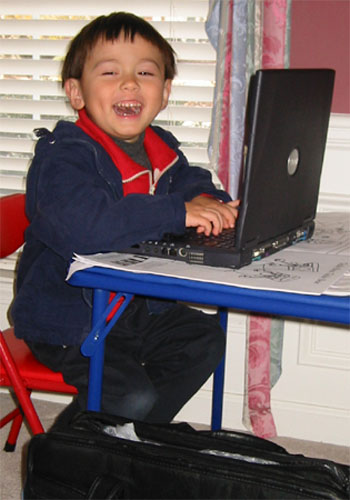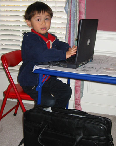 12/16/05 - Luka提著大電腦袋,要去出差了! 到了,先把電腦拿出來,準備要上班囉,媽媽你也要來上班....