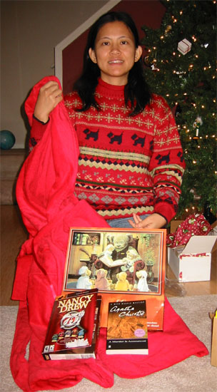拆禮物之前先來張全家福。 媽媽今年的禮物 - 書、拼圖、電腦遊戲、和浴袍!〈那件浴袍真是跌破媽媽眼鏡!因為爸爸站在百貨公司裡,不知該買什麼好,然後想到媽媽前幾天經期來時不小心留下一滴小紅點在浴袍上,於是就決定要買浴袍....阿那個又不是洗不掉啊!更好笑的是,爸爸忘了把標籤撕掉,被媽媽發現那件浴袍要比媽媽一件洋裝貴!於是媽媽有了一件洗澡完只穿五分鐘的豪華浴袍.......〉