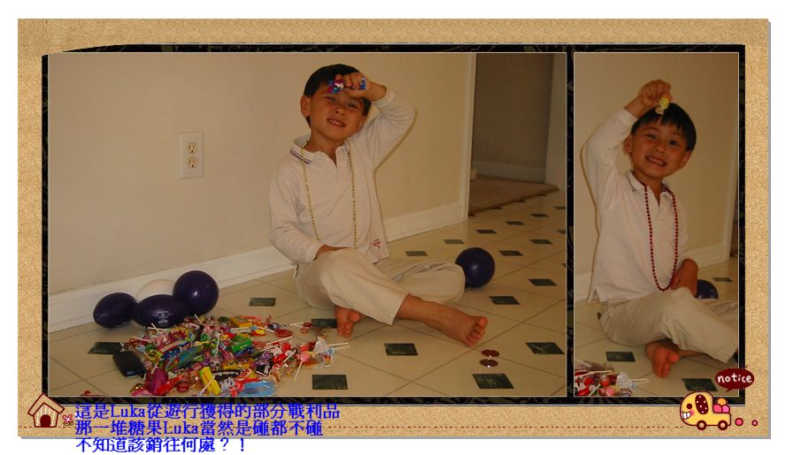 9/29/07 - 每年的九月底秋天來時那個週末兩天,住家附近的city都會舉辦autumn festival秋季慶典,活動不外就是在市中心有大型園遊會、音樂會,然後星期六早上由歷時兩三個小時的遊行揭開慶典的序幕。今年Luka學校第一次參加遊行,所以我們也共襄盛舉,星期六一早就跑去湊熱鬧,不過不是參加遊行隊伍跟著走,而是在路旁邊觀賞遊行隊伍。後來發現看比真的去走有趣,因為遊行隊伍不斷往路旁的小朋友丟糖果、玩具、珠子項鍊之類的小東西,所以路旁的小朋友撿糖果、籃球、橄欖球、國旗等,撿得不亦樂乎。有經驗的小朋友〈應該是父母〉都人手一個提藍或袋子,裝戰利品用,我們沒預期會有這些戰利品,所以Luka用應該戴在頭上的棒球帽裝,滿了就倒進媽媽的袋子。有些遊行的人還會特地對準Luka的帽子或小朋友的提藍,練習射藍;有些走經過Luka的人則是乾脆抓一大把糖果放到Luka的帽子。很有趣的遊行。