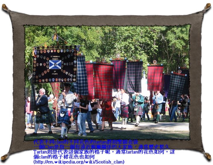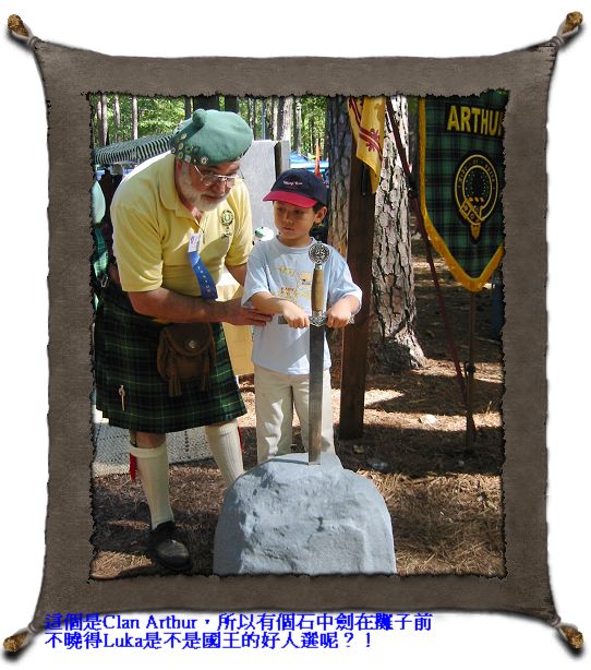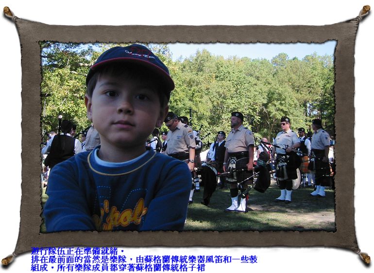 10/21/07 - 附近石頭山Stone Mountain有個一年一度的Scottish Festival,廣告說有比賽、遊行、表演等等等各種活動,雖然我們跟蘇格蘭一點關係也沒有,不過Luka爹娘都還蠻喜歡風笛(bagpipe)的音樂,又看到有表演和遊行,於是決定去湊湊熱鬧。果然熱鬧滾滾,有蘇格蘭傳統舞蹈比賽、丟鉛球比賽、豎琴比賽〈有個參賽者還一邊演奏一邊唱歌一邊解釋歌詞裡的故事,結果時間不夠表演〉,有牧羊犬如何牧羊表演、不同樂團表演、老鷹表演,遊行則是由風笛手和鼓手組成的樂隊最搶眼。每個攤位則是由不同的clan設的,介紹這個clan的歷史和在蘇格蘭的地理位置。雖然有對一般大眾開放,不過這個慶典比較像是為蘇格蘭在美國的各個clan的後代子孫聚會交流聯絡感情而舉辦的,所以外人好像不多,一看Luka娘就知道我們是來湊熱鬧的,不過管他的,我們逛得挺高興就好。