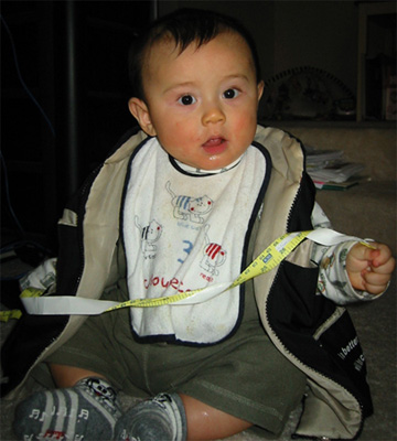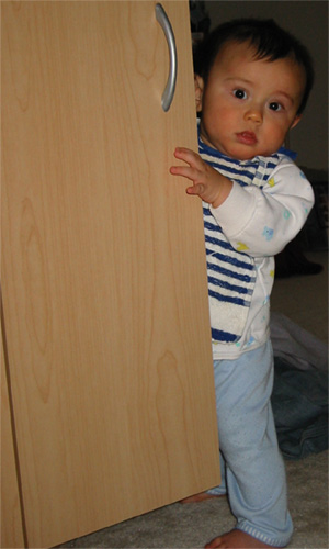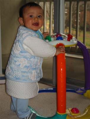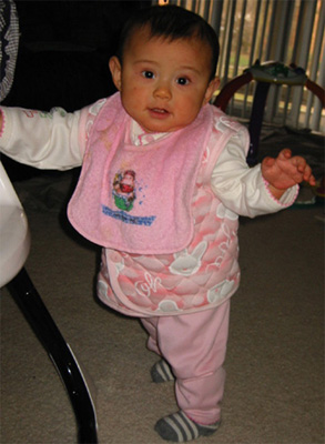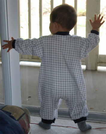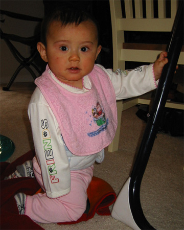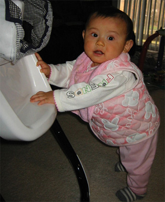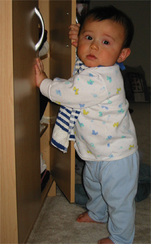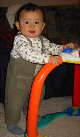 2/18/03 - 自台灣回來後,Luka漸漸從爬蟲類演進到靈長類,不但爬行迅速,花了兩天學會爬樓梯,還開始四處扶著東西站起來,已經可以扶著東西走路了。地板上的東西,每樣Luka都嚐過了,新的目標是放在桌上的東西!