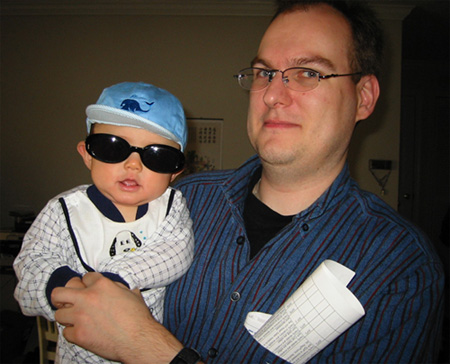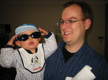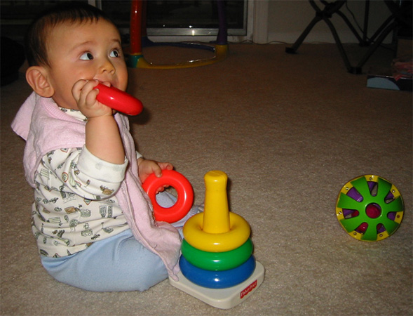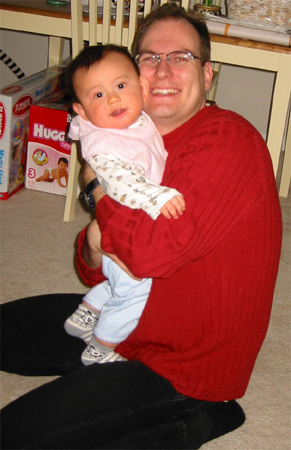 2/26/03 - 爸爸剛從法國出差回家,Luka好興奮!不過只一下下就忘記了,繼續吃他的玩具.......