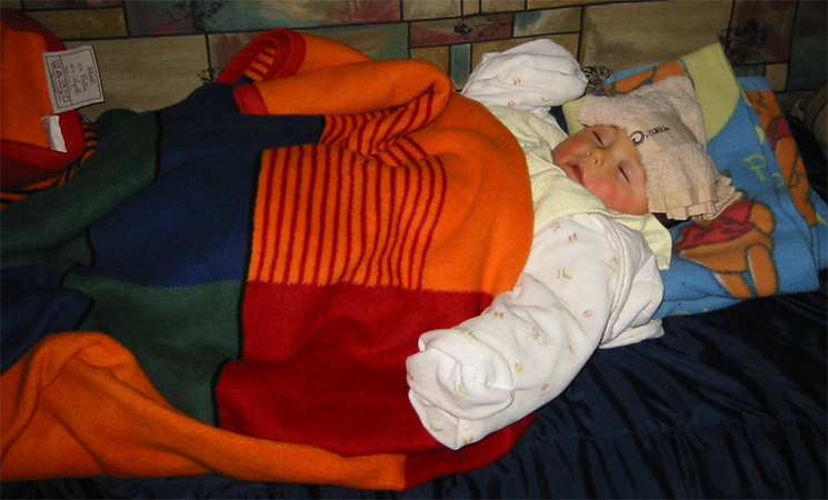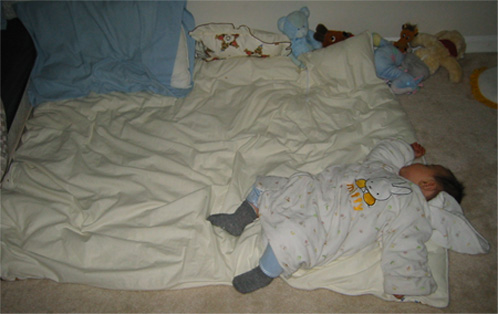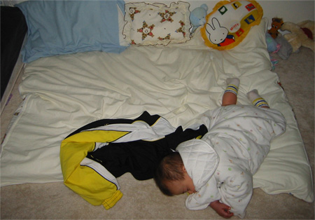 3/21, 3/23/03 - 最開始時,Luka是睡在藍色枕頭那一邊,頭靠枕頭,仰躺著睡。這是不同天半小時後Luka的位置與睡姿!最近還每晚敲敲床上的媽媽,然後擠到舒服的床上,不過通常五分鐘後,Luka就會一個翻身,又翻回地上!這也是為什麼他需要溫暖的睡衣,不需要被子。