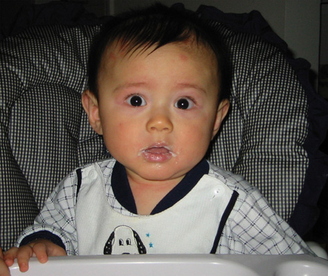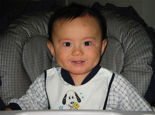 3/23/03 - 雖然Luka已經八個月大,餵他吃飯仍然是一件艱鉅的工作,而且更困難,因為他力氣愈來愈大,會翻身,知道用舌頭把奶嘴頂出來,知道把嘴巴閉緊!只能很阿Q地安慰自己,起碼Luka不是笨寶寶啦!