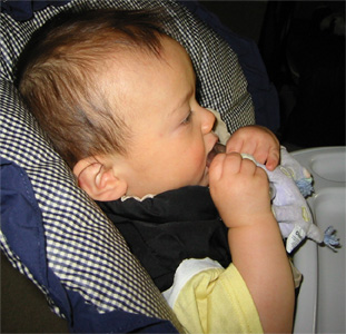 4/16/03 - 累了,吃吃手指頭        要搬家了,Luka喜歡"幫忙"打包。不過他的方法是把所有媽媽折好、放好的東西丟滿地,然後落跑!