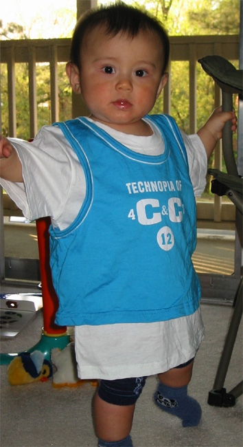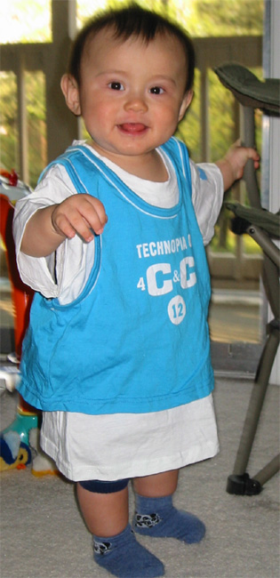 4/3/03 - 新衣服!不過好像太大了點兒,倒是就不用穿褲褲,媽媽少洗一些衣服!