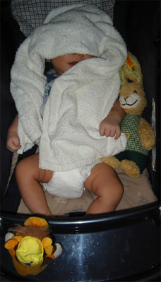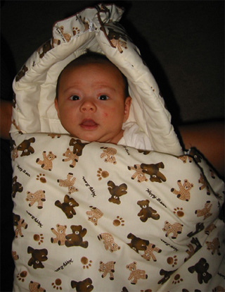9/12/02 - Hi! 9/14/02 - 天氣冷冷,躲到抱袋裡取暖 衣服上標籤說適合3-6個月寶寶,不過Luka