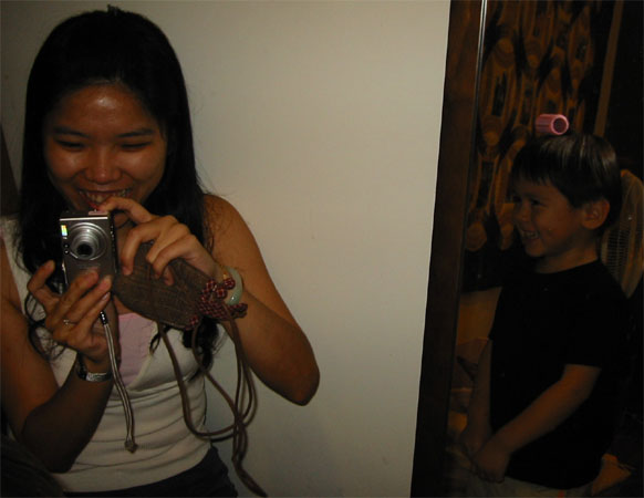 這張不知在幹麼? 11/3/05 - 鏡子裡的Luka看起來又在耍寶了,乾媽在照耍寶的Luka