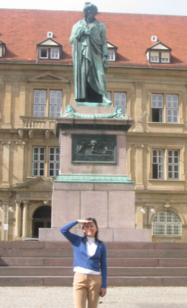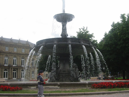 星期一,Luka的爹要開始工作了,在Metzingen,我們的旅館就在那兒。Luka的媽則計畫今天到離Metzingen最近的大城市Stuttgart一遊。很可惜我們早來二星期,因為Stuttgart從9/25開始的啤酒節號稱德國第二大,僅次於慕尼黑!根據網路上蒐集到的資料,Stuttgart的火車站前有一條長長的購物街,市區內還有幾個很大很值得一遊的公園,於是Luka的爹把我們載到火車站前,我們就先從這條購物街開始。這條購物街真的很長!走一段路之後,一旁還有一間城堡和城堡前的寧靜小公園〈其實若不是老公後來說那是個城堡,我還以為是個蓋得比較不一樣的政府機構呢!〉。基本上在這條長長大街走一陣子後,就已經沒力再往完全相反方向的公園晃去,於是我們就在這條街上,悠哉地晃了一天,直到老公下班來找我們吃晚餐。